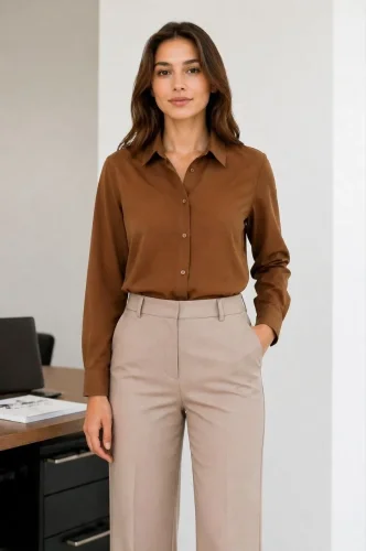 Uzun Kol Gömlek Düğmeli Klasik Yaka Günlük ve Ofis Şıklığına uygun Kahverengi